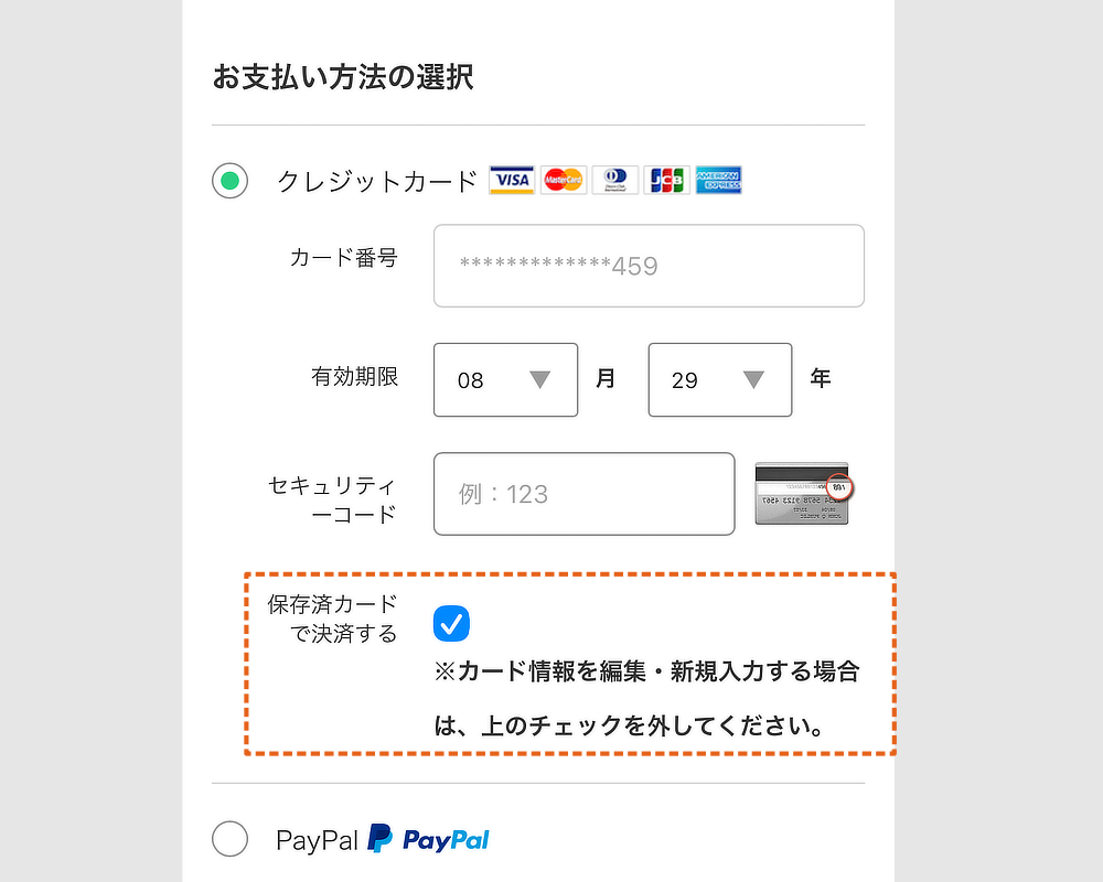 「カードの有効期限が過ぎた」「違うカードに変更したい」などの場合は、ログイン後のご購入画面で、「保存カードで決済する」のチェックボタンを外し、新しいカード情報をご入力ください。
