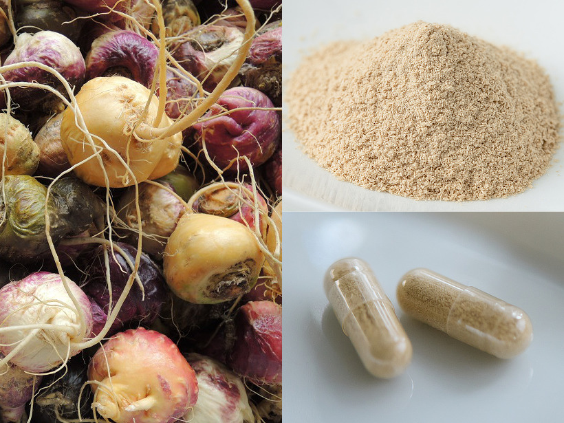 「イヌリン」とは、水溶性食物繊維のひとつ。ネバネバのゲル状で糖質をくるみ、吸収を遅らせ、血糖値の上昇をゆるやかにする機能性が認められた成分です。