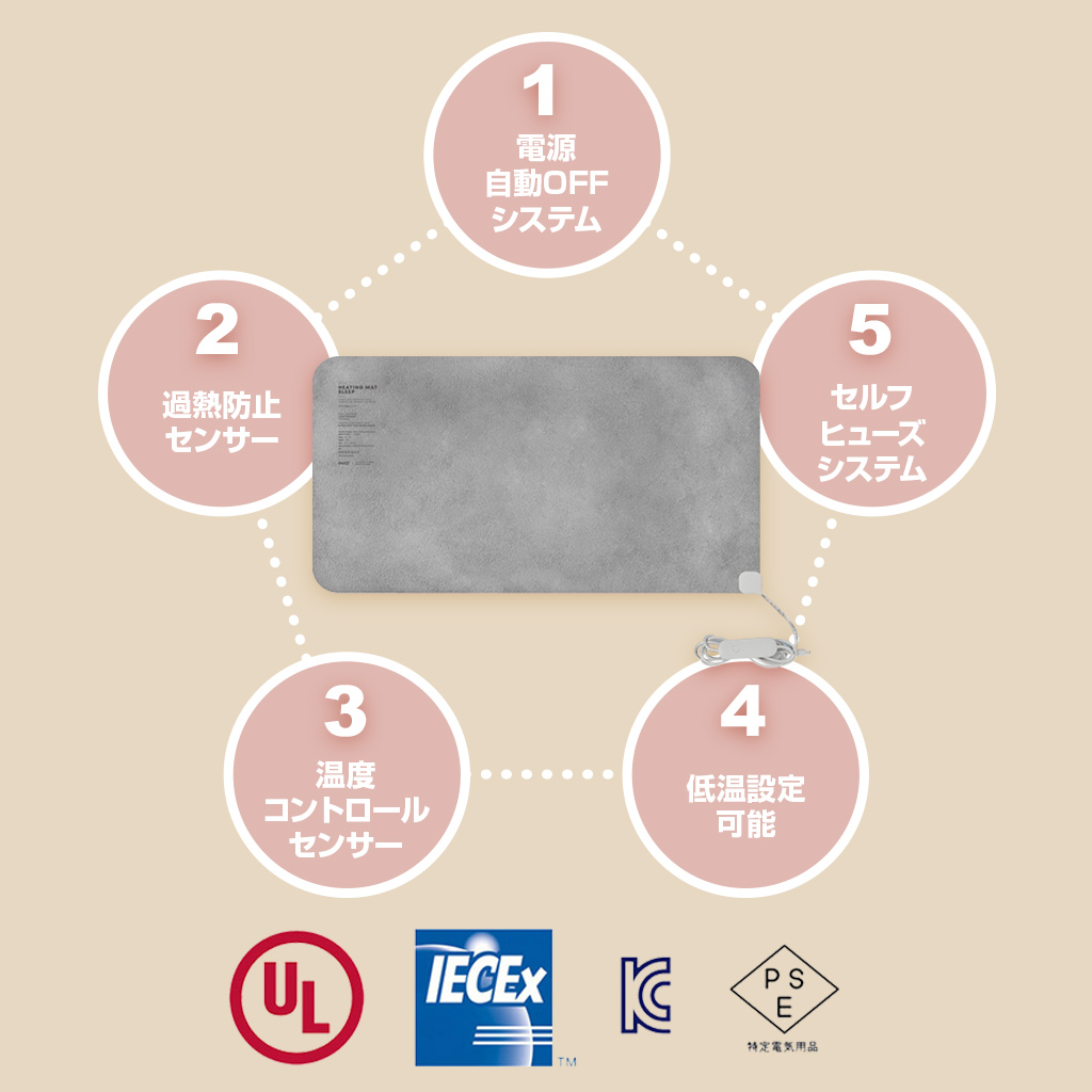 ヒーター使用時の心配を解消するため、INKOのヒーティングマットには5つの安全機能を搭載。さらに安全性を高めるため、3つの温度センサーを採用しています。