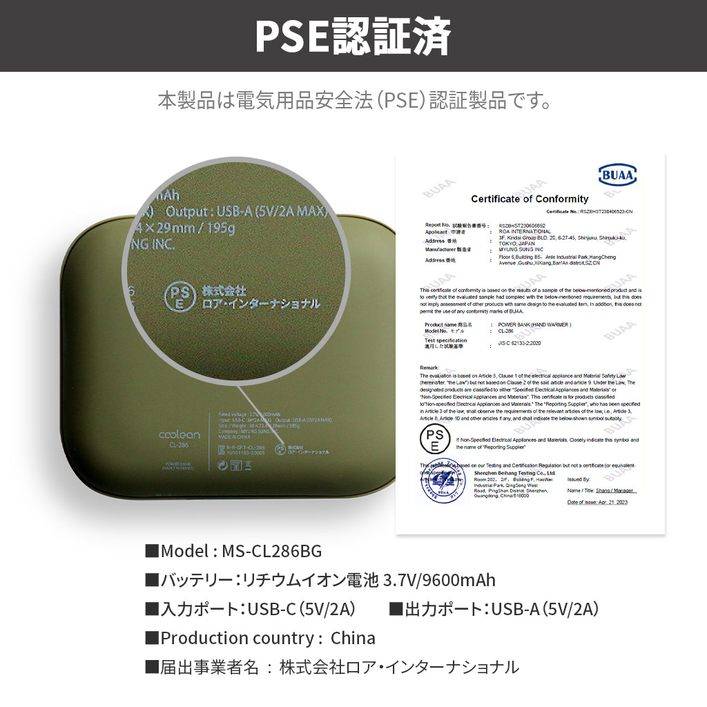 電気用品安全法(PSE)技術基準適合証明を取得済みです。