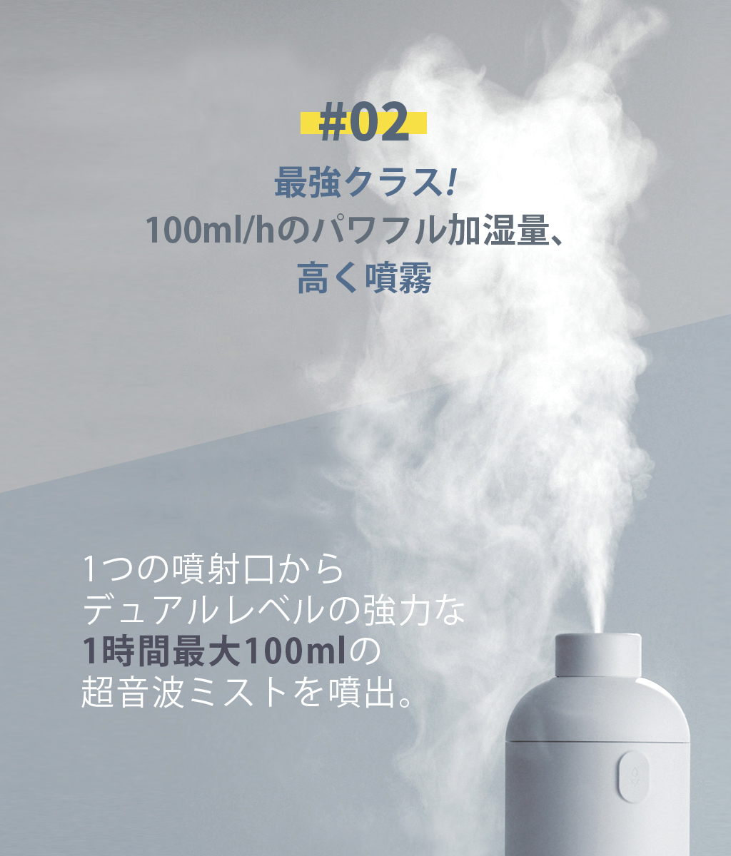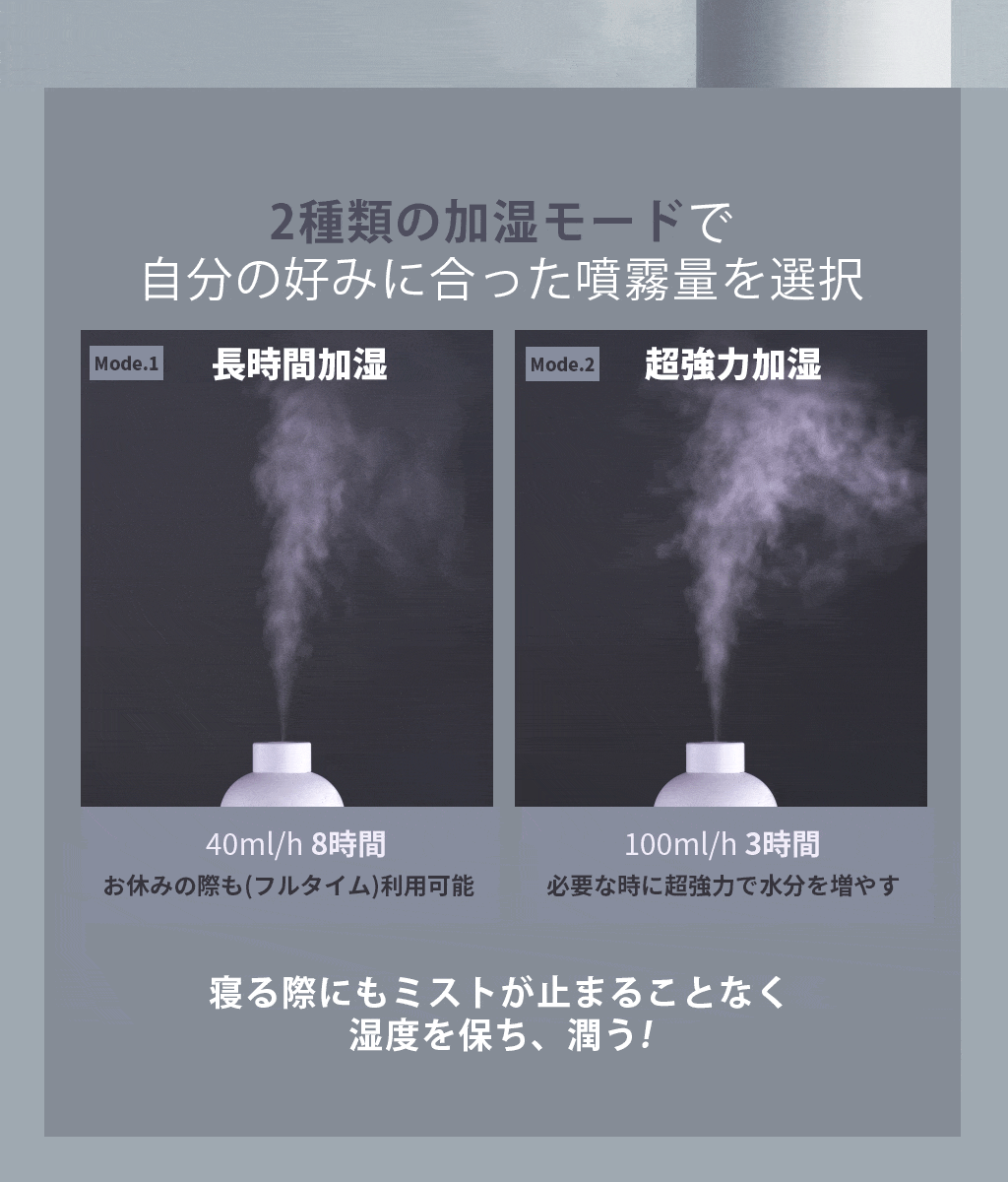噴出したミストは床に流れる暇もなく、高く、素早く、強力な加湿量を長く保ち、快適な空気環境をキープ。2種類の加湿モードで、好みの噴霧量を選択できます。