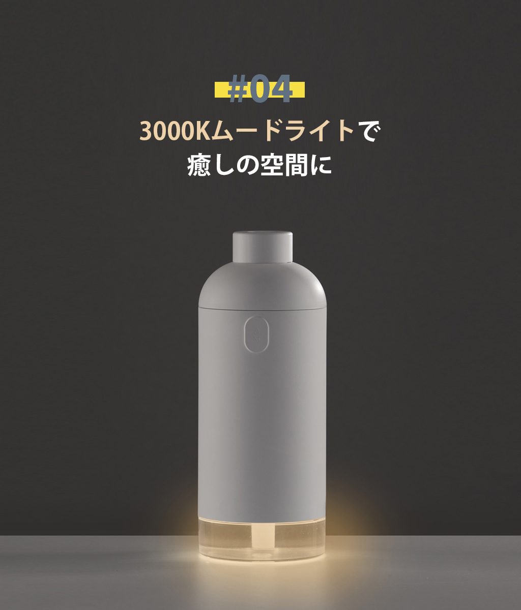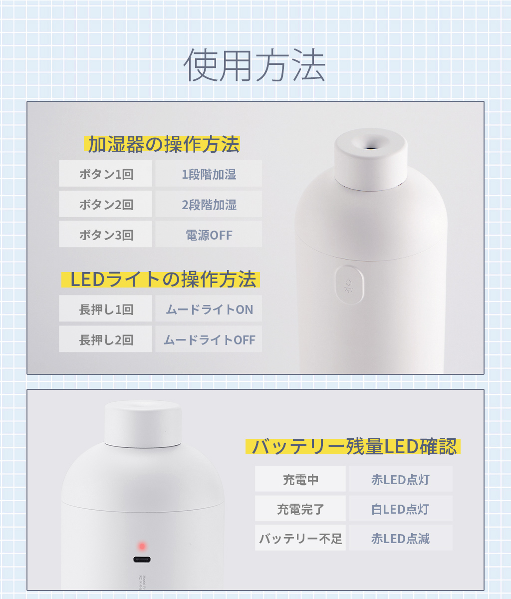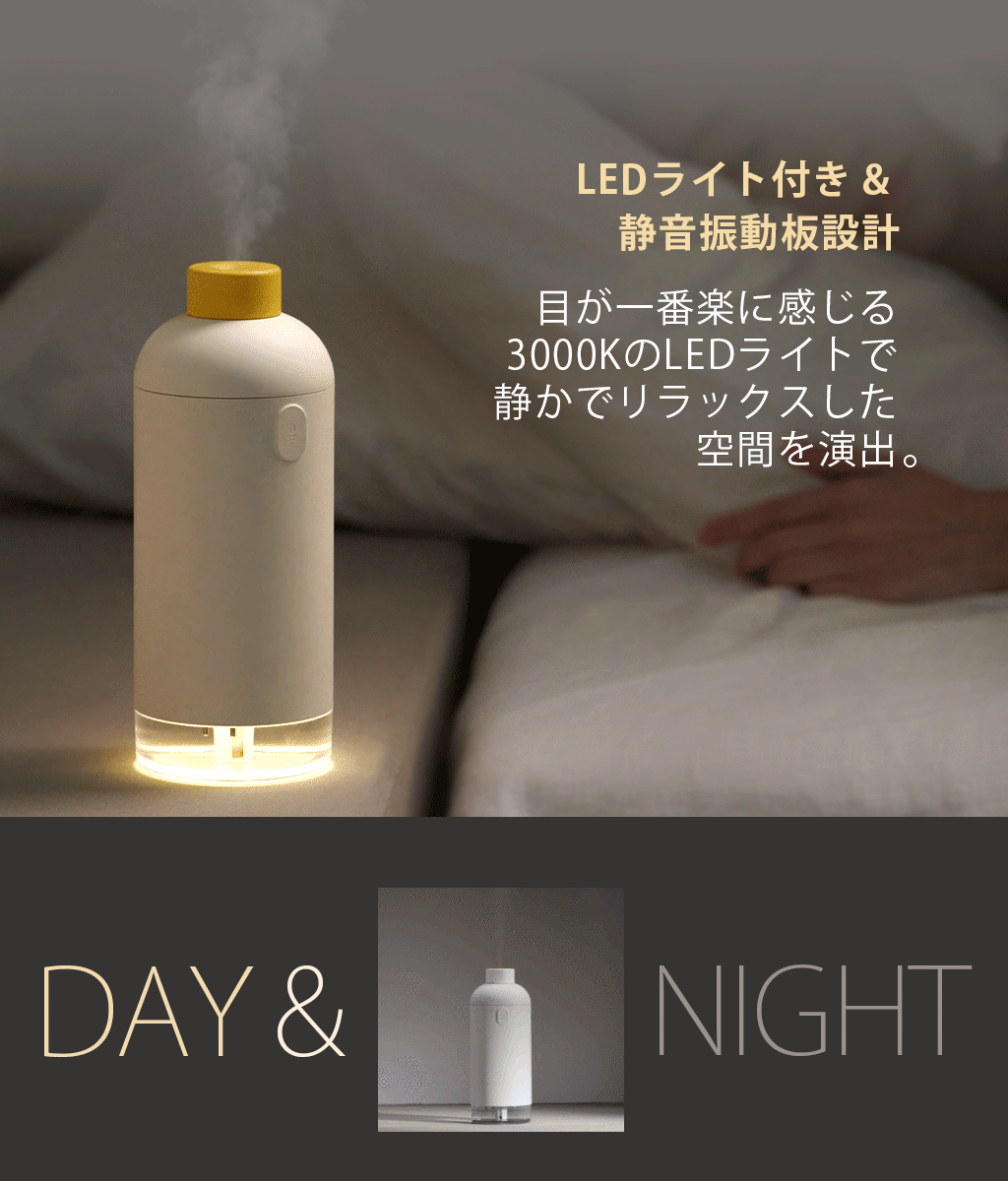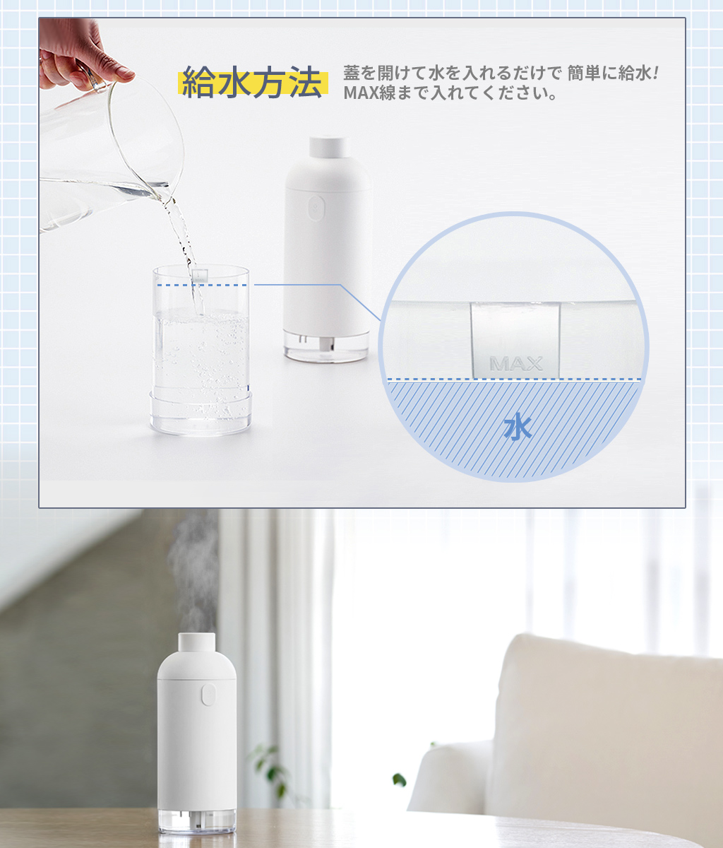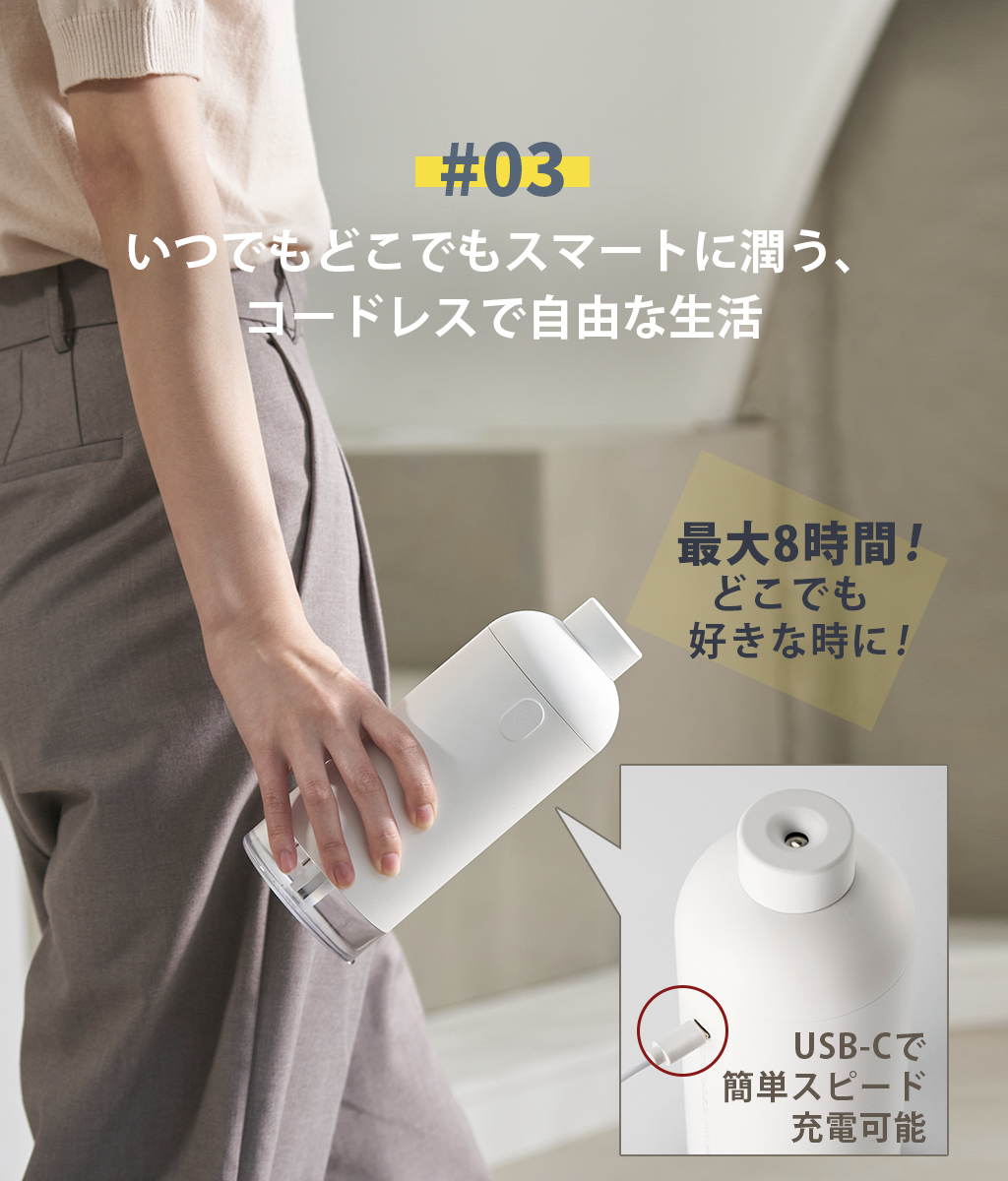 2200mAhのリチウムイオンバッテリーを搭載し、USBで充電してコードレス利用が可能。どこでも好きな時に、置く場所を選ばずに加湿できます。