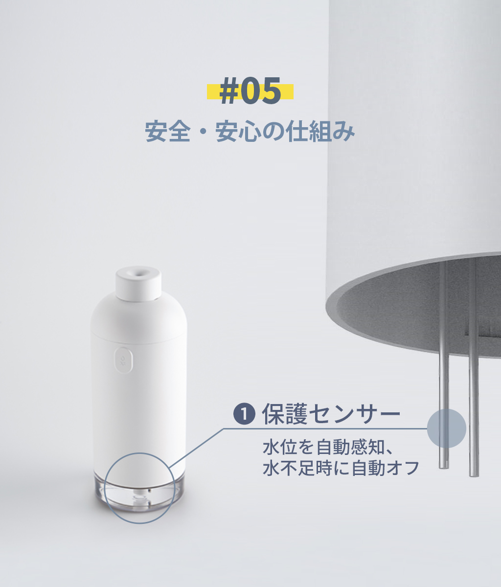 安全保護センサーは、水の水位を自動感知し、水不足時は電源を自動OFF。水の入れ忘れの心配がなく、空焚き防止して、加湿器とフィルターの寿命を保護します。