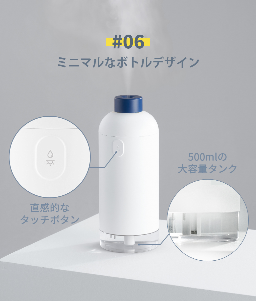 コンパクトでありながら500mlの大容量に、直感的なタッチボタンのみ。必要最低限の機能とサイズで、空間に満足感を与えます。