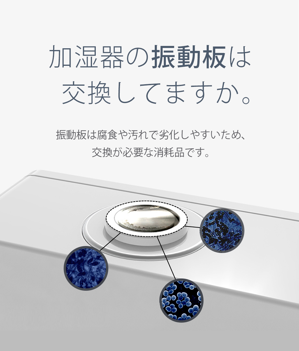 フィルターはもちろんのこと、振動板も交換できクリーンに使え、きれいな水だけで豊かにミストを噴霧。いつまでも清潔に加湿できます。
