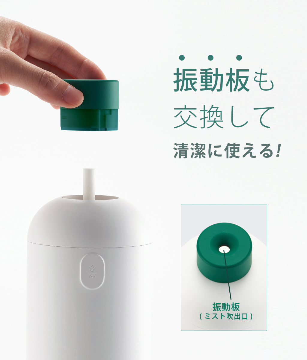「BLUEFEEL(ブルーフィール) コードレス加湿器 SWADA(スワダ)」は、振動板(ミスト吹出口)が簡単に交換できるポータブル超音波式加湿器。