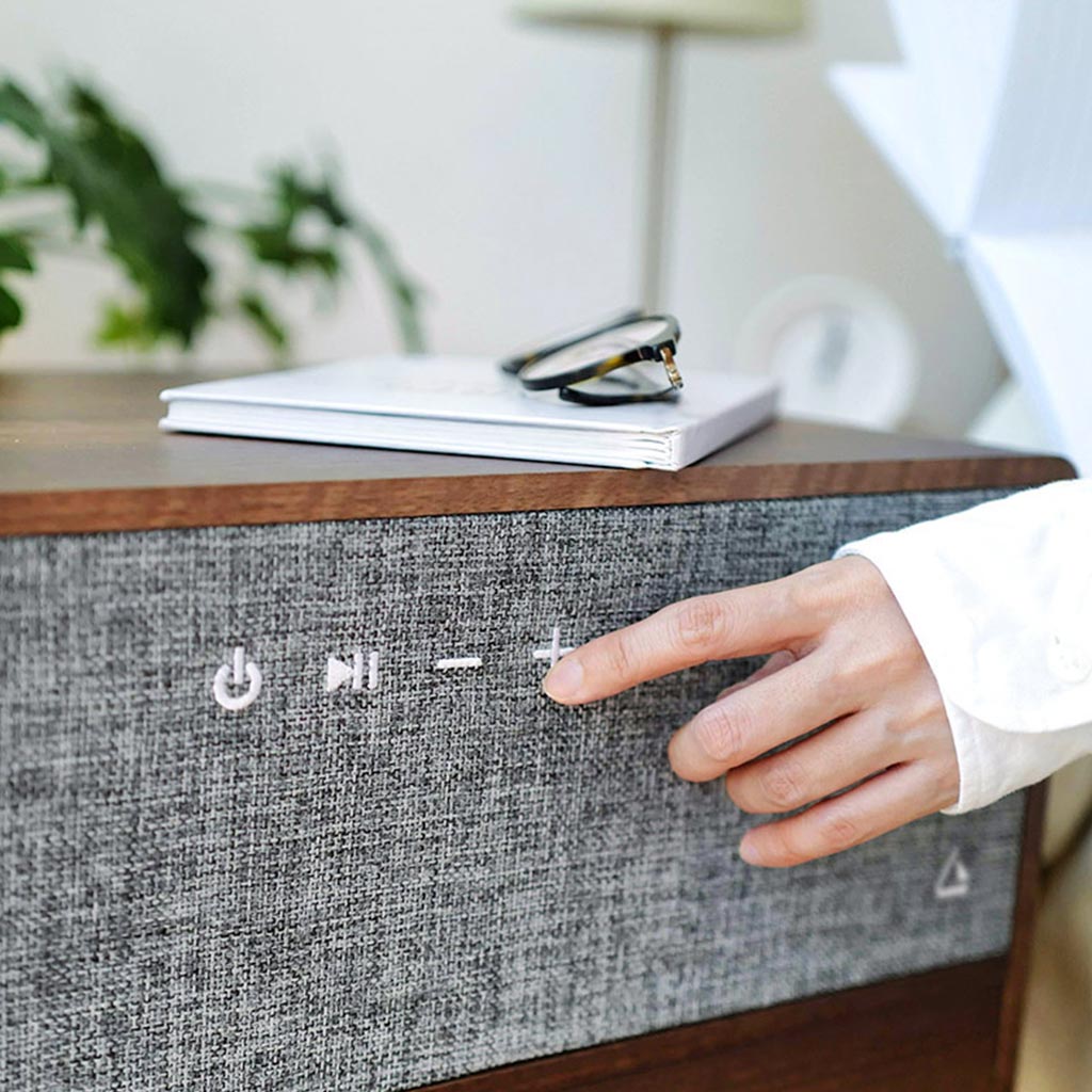 スピーカー部分には落ち着いた風合いのファブリック素材を採用。操作ボタンは、刺繍で仕上げられており、ディテールにもこだわった上品なデザインです。