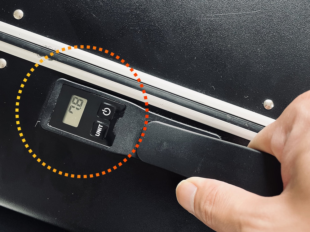 まず自慢したいのが、さりげないデザインの重量計。スイッチボタンを押してハンドルを持ち上げるだけで測れるってスゴくないですか?!