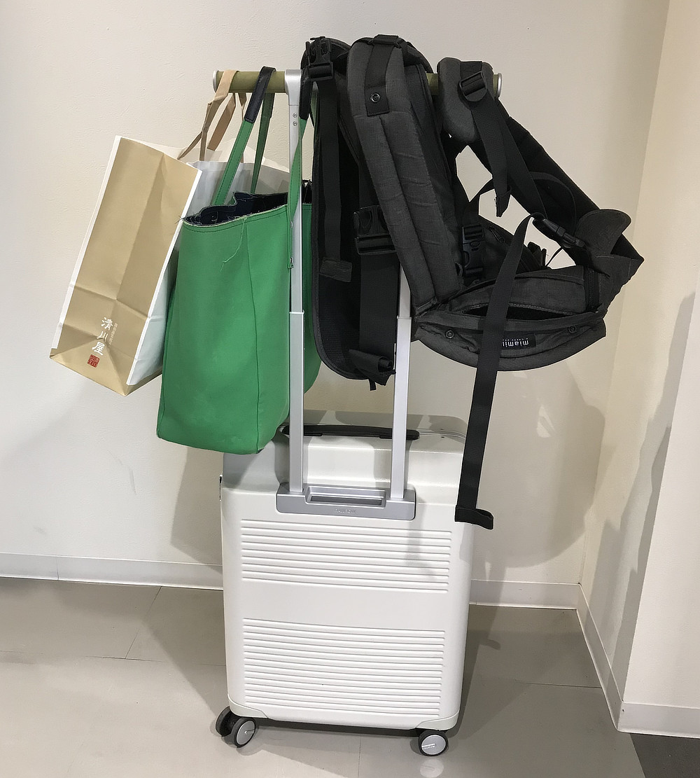 冒頭の写真は、息子が1歳の時、飛行機・電車・バスを乗り継いで山形へ旅行した時のもの。しまい込めない子どものお世話グッズも、帰り空港で買ったお土産のブドウと桃も、ハンドルにヒョイっ。トートとか紙袋をかけた上から、ジャケットも掛けられるし、よほどのことがないと倒れない。子どもを抱っこしながらの移動では本当に助かりました。