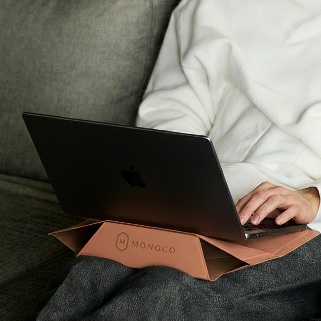 ノートPCケースが、姿勢を整えるスタンドに変身!社員の健やかなワークスタイルを願う贈り物に。名入れ可。