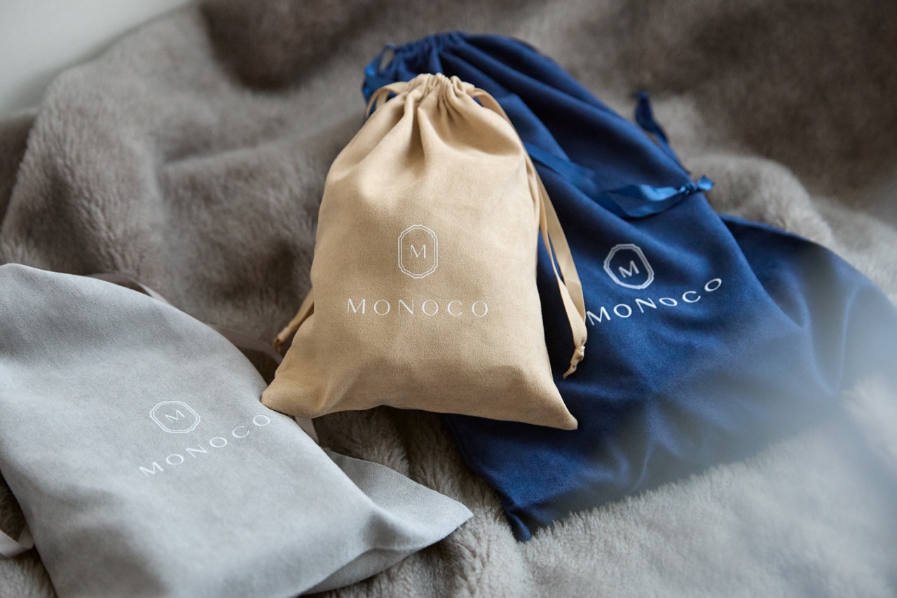 従業員に直接手渡しし、持ち運ぶのに便利なショッパーもご用意。クリーンな「白」に、MONOCOロゴを中央に印字したミニマムデザイン。S・Mの2サイズでご用意。このデザイン以外でも御社オリジナル制作可能。