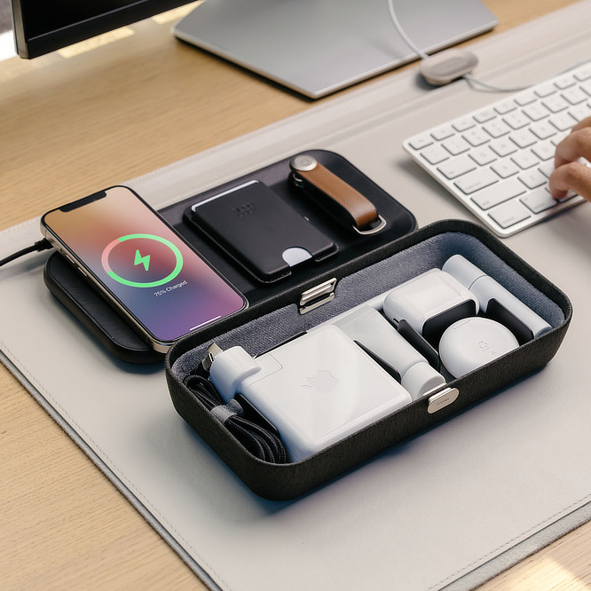 ケースを開ければ、USBケーブルやマウス、タッチペン、イヤホンが、一目瞭然。まるで、小さな「マイデスク」。スマホのワイヤレス充電も可能。