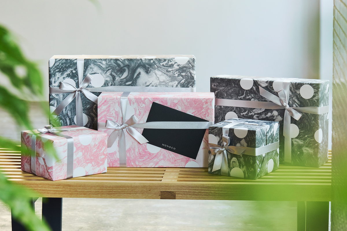 MONOCOシグネチャーラッピング。大理石のような流線模様に、ドット柄を重ねた「みたことのないデザイン」。よりフォーマルな贈り物には七宝柄デザインもご用意。